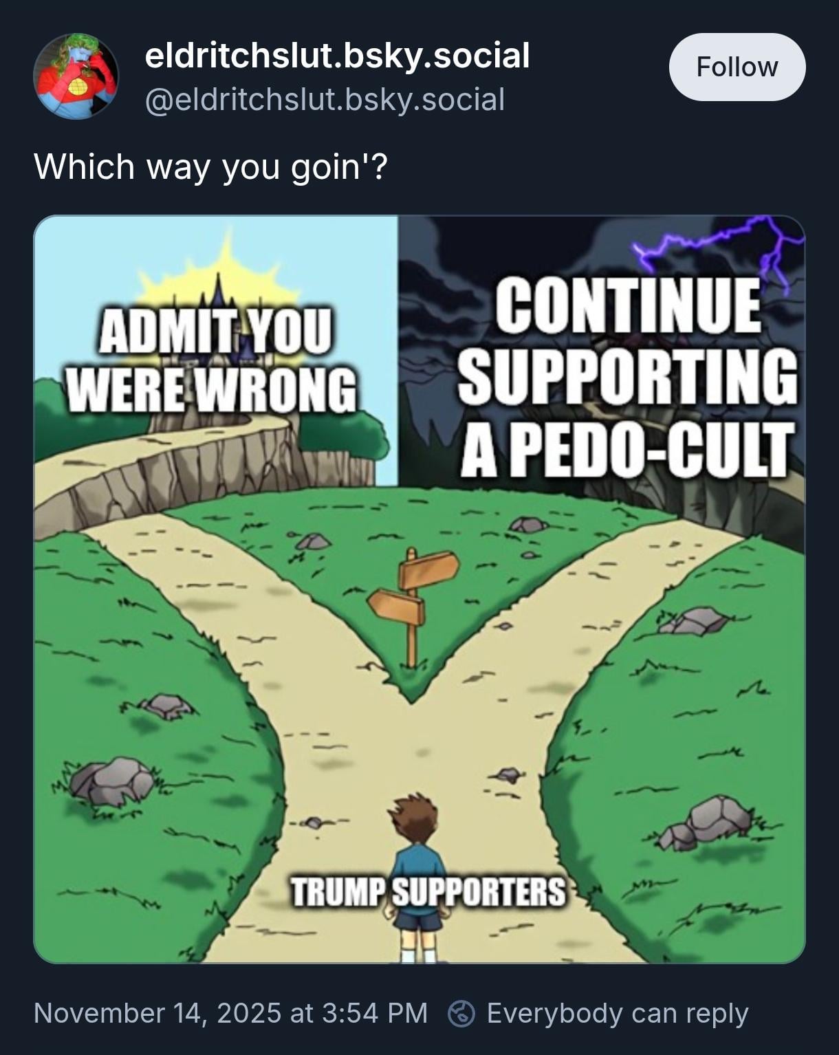Of course his followers will take the path on the Right. I’ve heard arguments that the Epstein girls were teens and post-pubescent and teens, so it wasn’t “pedophilia.” Trump is heavily implicated in Epstein documents. But he doesn’t come out and explain or deny it, he just blocks the the release of documents and gets angry that America won’t just let him sweep it under the rug.