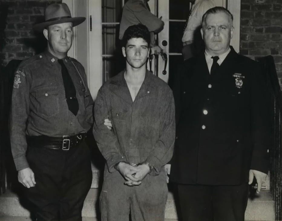 Bedford Village Police Chief Frank Mallette (left) and Connecticut State Trooper Charles Flanagan (right) pose with Edward Haight, 16, after his arrest for kidnapping, torturing, and murdering sisters Helen and Margaret Lynch, ages 8 and 7, in Bedford Village (New York, 1942) [932 x 730].
