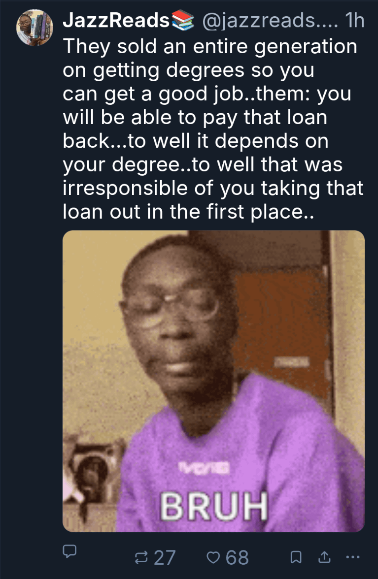 Going to college just to be told your degree is useless… if it’s useless why is it an option 😀