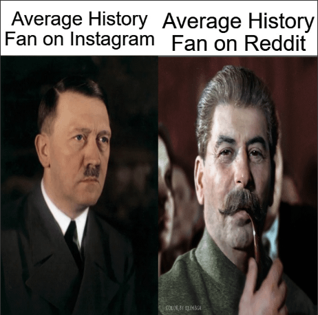 I’d also really like to know if we can ever talk about the crimes of one of them while not minimising the other one’s. Eastern Europeans suffered much more under the guy on the left (you should have switched them, OP…) yet they hate the guy on the right passionately.