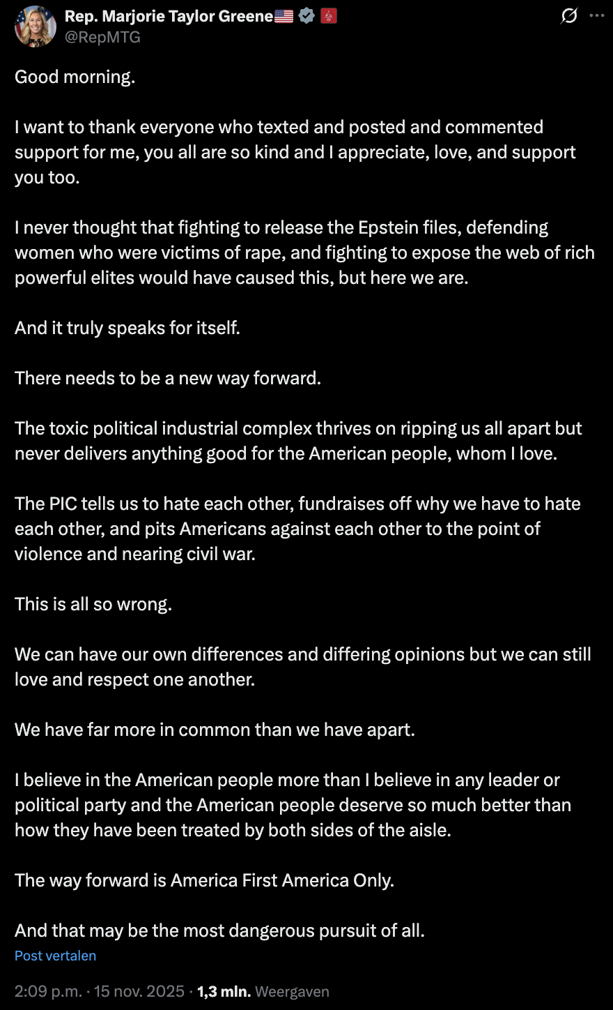 20. Don’t really care what her motives are at this point, pushing the Epstein files and fracturing the maga cult is a good result