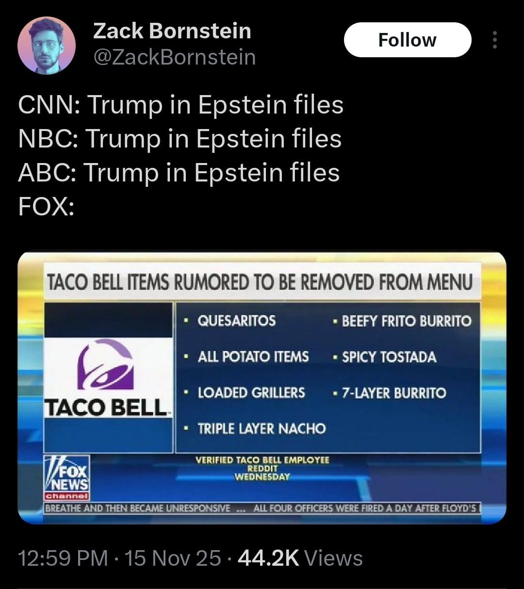 And just like that, Fox News has nothing at all to say about pedophiles, pedophile rings, adrenochrome, frazzledrip, pedophile pizza emojis, pizzeria pedophile basements, child sex trafficking, and releasing the Epstein files.