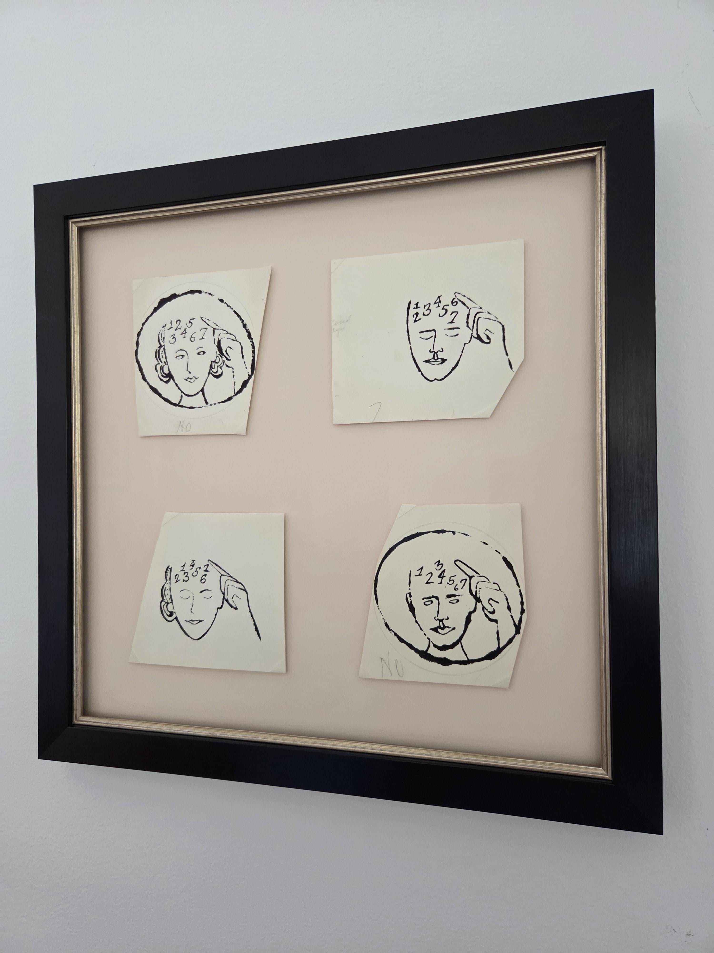 Blotted line prints. Andy Warhol, 1952ish. Some ad campaign that he was working on. Maybe "brain pills" or something to help with math? Counting sheep/sleep aid? The ones with open eyes were marked "no" by unknown hand.