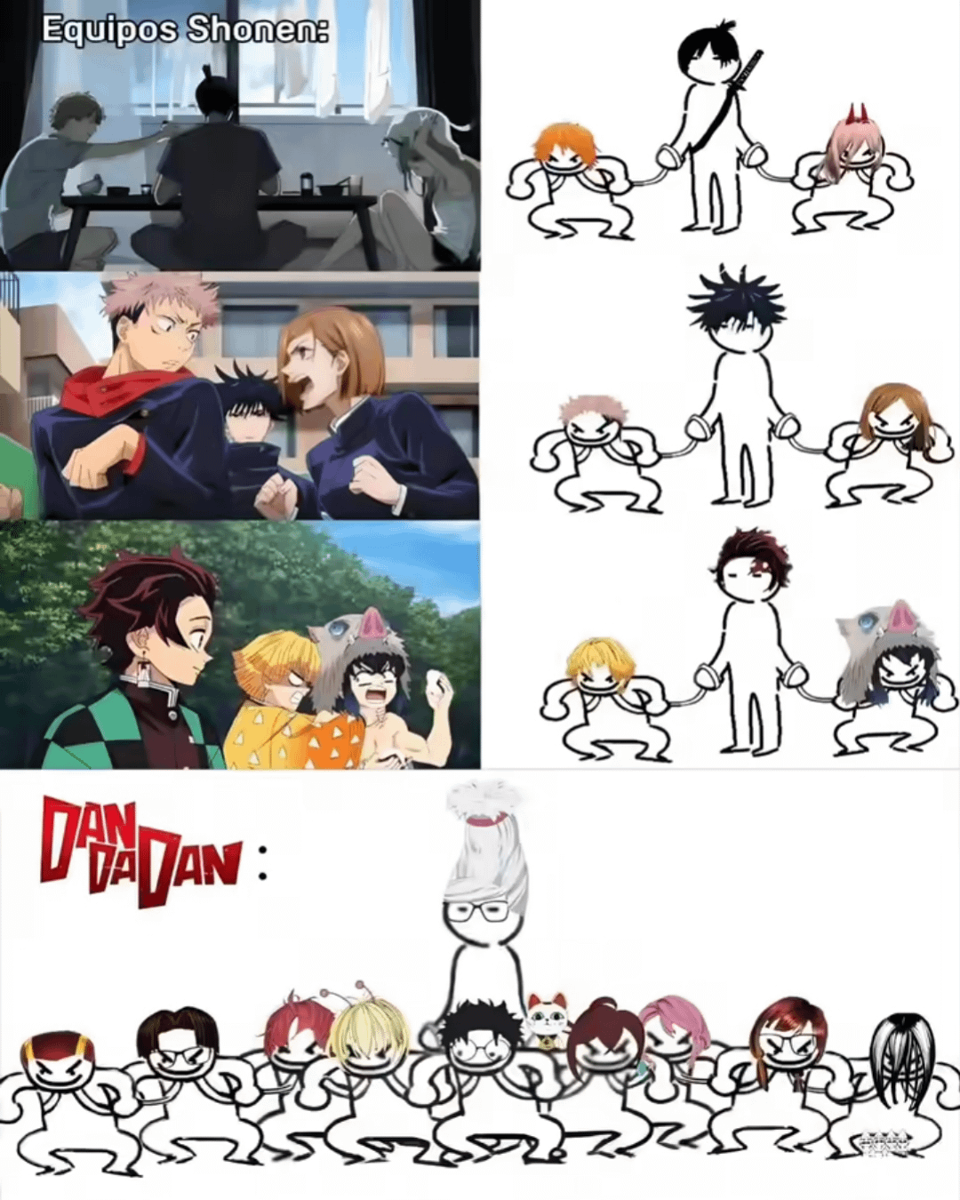 Shonen squads be trios holding hands while Dandadan pulls up with an entire chaotic neighborhood doing ring around rosy today
