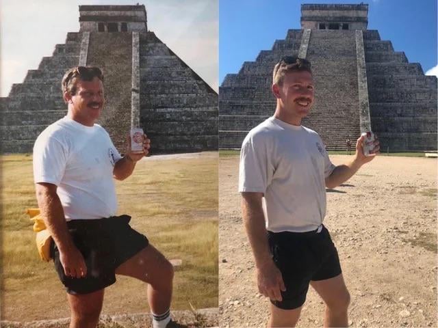 This is so wholesome, like a perfect time loop of mustaches, shorts and cold drinks at Chichen Itza