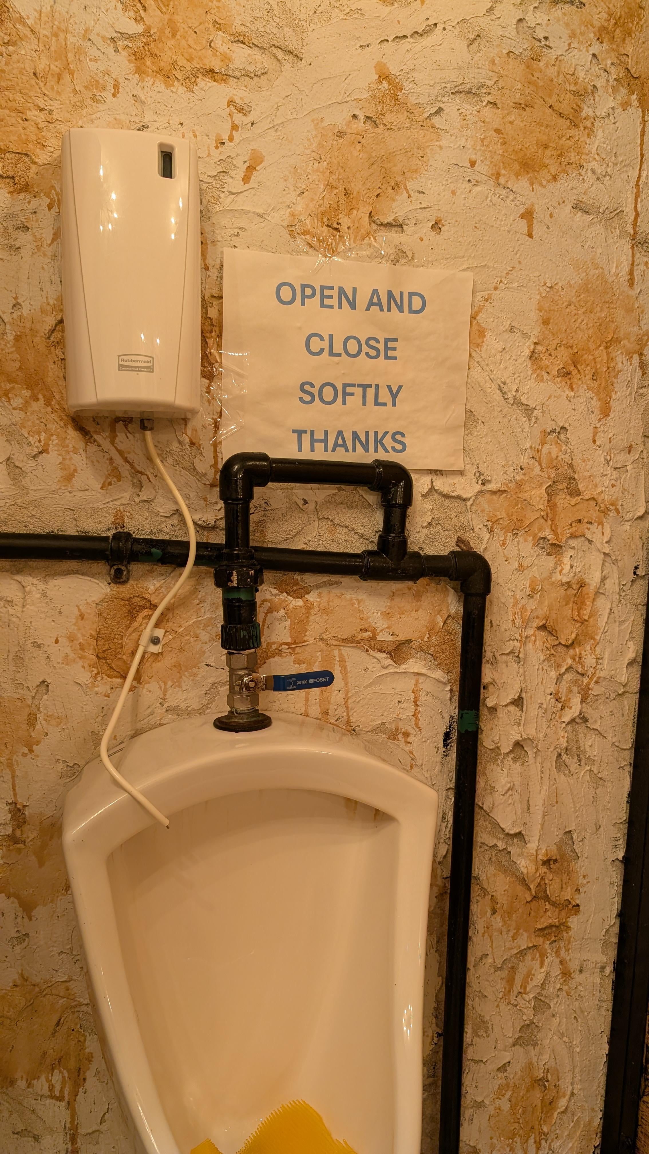 This is the final boss of urinals. No sensor, no button – just a full-blown plumbing control system that makes you feel like you shouldn’t even be touching it without OSHA certification. The sign saying “OPEN AND CLOSE SOFTLY” is basically a threat.