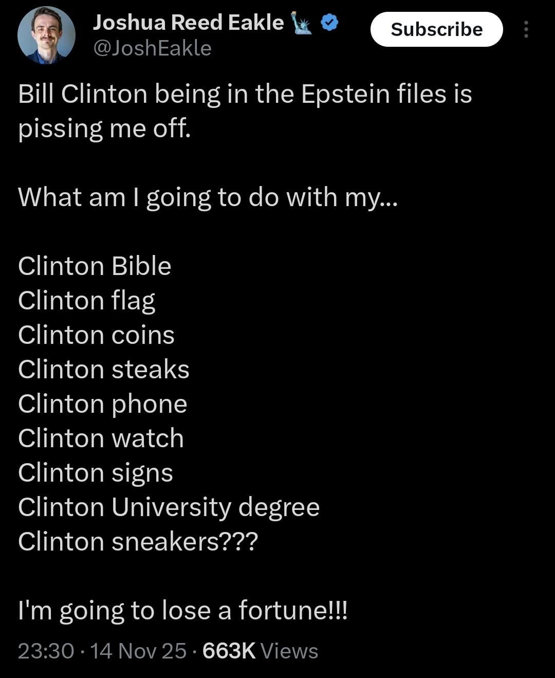 I love the OP and laughed. But, in all seriousness, “ok bring down Clinton but Trump has to go down and do more time than Clinton as he’s far more involved.”