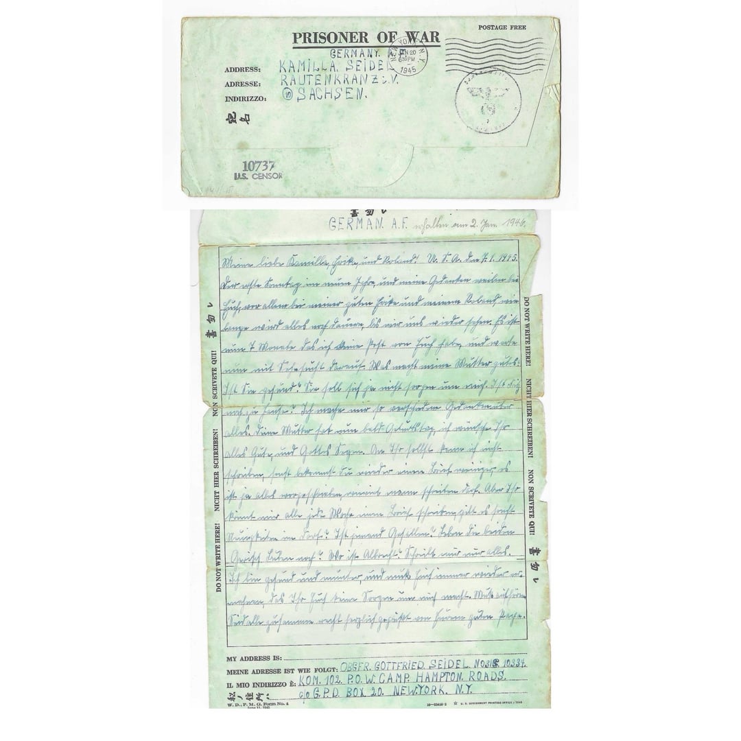 This letter was written by a German prisoner of war named Gottfried Seidel. After his capture, he was transported to the United States and processed through the Hampton Roads Port of Embarkation in Virginia, a major reception and transit center for POWs arriving by ship during WW2. This letter was written on January 7th, 1945, and was likely sent shortly after his arrival in the United States.”