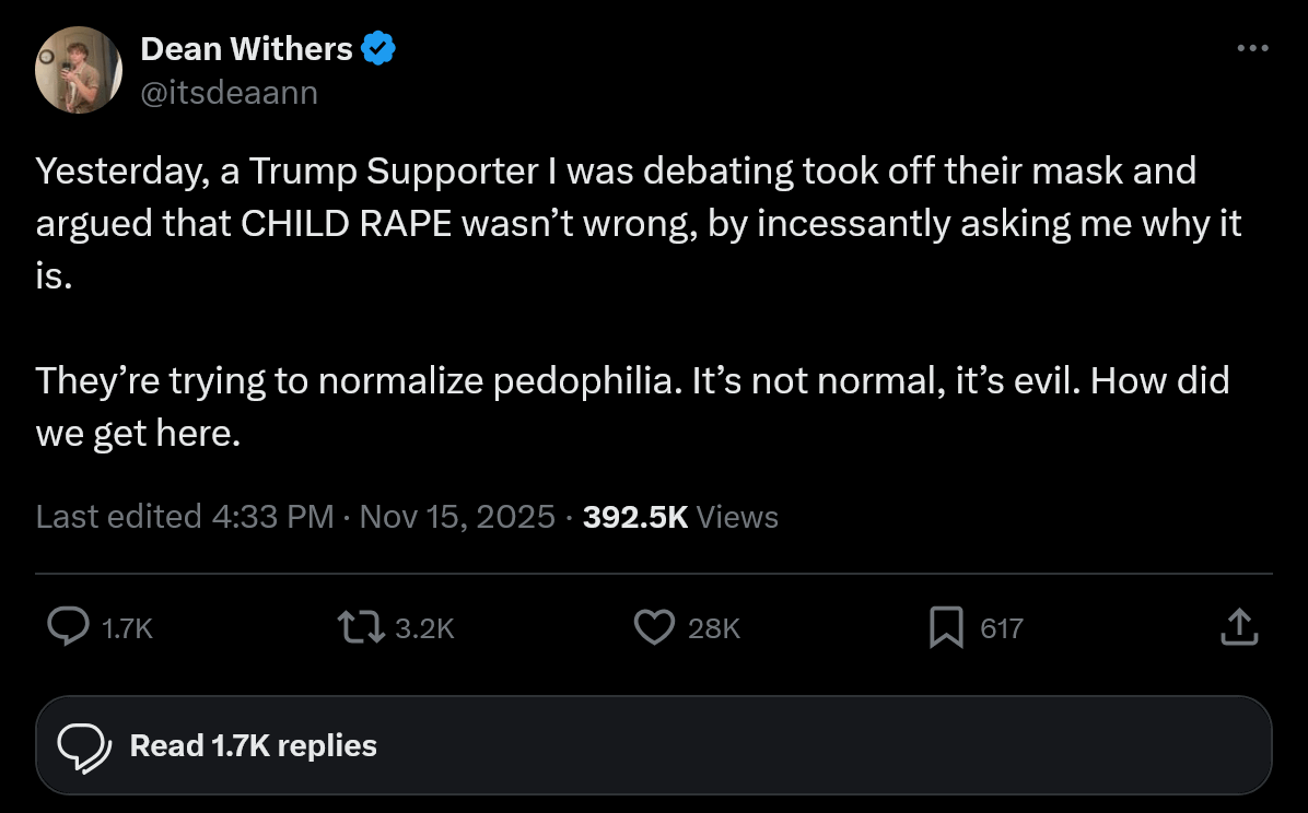 They understand why it’s wrong. They understand most of the moral/ethical issues that they *act* stupid about. When they’re exposed a little too hard, they double down on the dumb act, and lean all their weight into aimless antagonism. This pattern is generations old, and has been extremely consistent. The subject is different this time, and the floundering is more obnoxious than usual because “pedophile bad” has been an ol’ reliable “foot-in-the-door” talking point for them – usually used to veer into disingenuous conflation of LGBT people and “MAP” advocates, or grooming, or what have you. I literally hope families that have broken up, or will in the near future, over these past 10 years’ politics, *never* get back together. I hope their kids never call and the retirement home nurses hate them. I sincerely hope when the pendulum swings back, the people responsible for, complicit with, or having been directly a part of this last gasp of conservative regressivism have to *beg* for work, money, food… I hope they suffer being dropped as dead weight by a world that outgrows them.