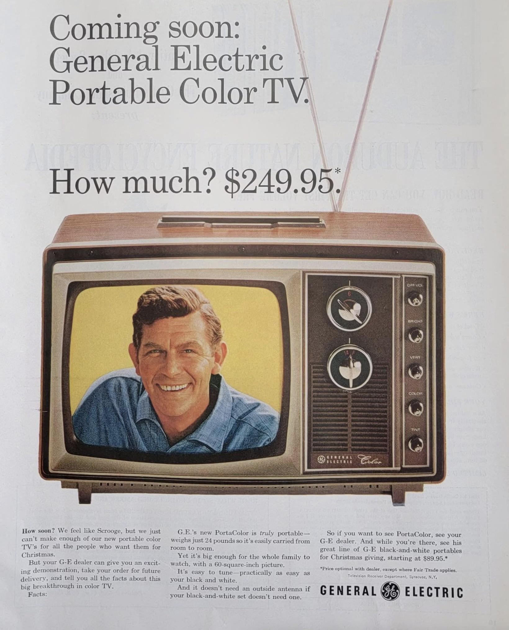 1965 Ad Announcing GE Portable Color TVs (featuring Andy Griffith)