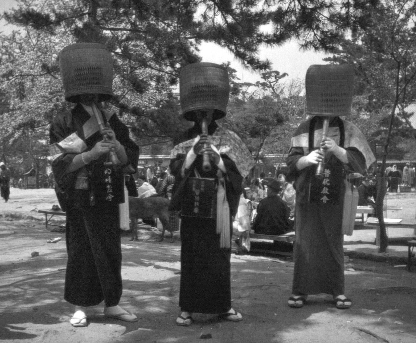 Three komusō (mendicant monks) playing shakuhachis. Japan, 1935 [1380×1140]