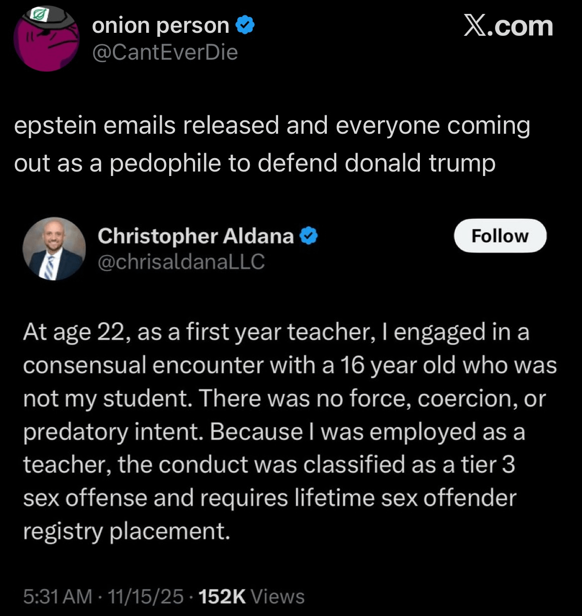 It’s wild watching grown adults sprint to the internet to confess to felonies just to cover for Trump. Epstein’s emails drop and suddenly half the GOP’s legal team is out here volunteering their own “Well actually, when I slept with a minor…” stories like that’s some kind of character witness.