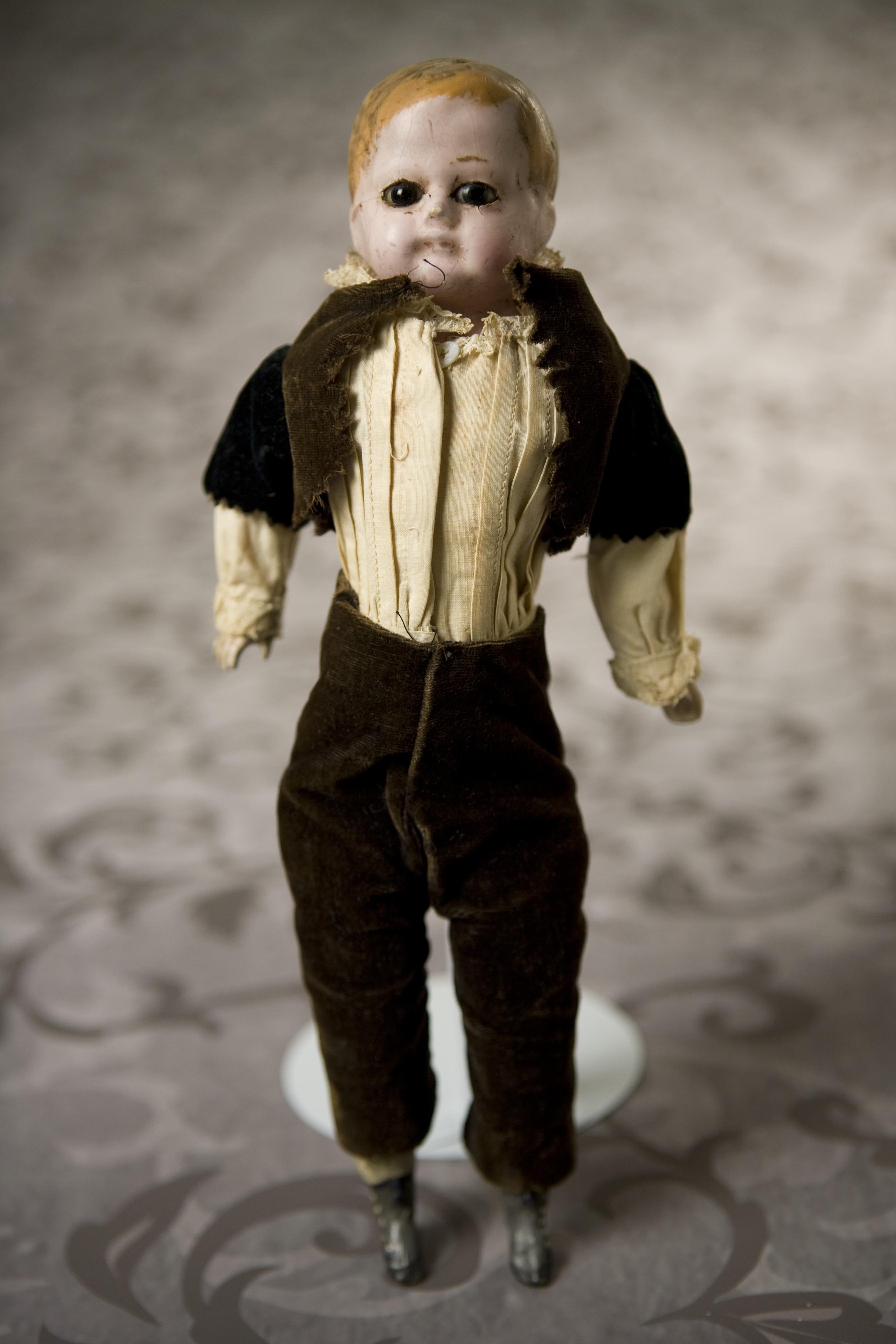 Wax over papier mache boy doll with painted blond hair and wearing a velvet suit, c. 1840. [2912×4368] by chubachus