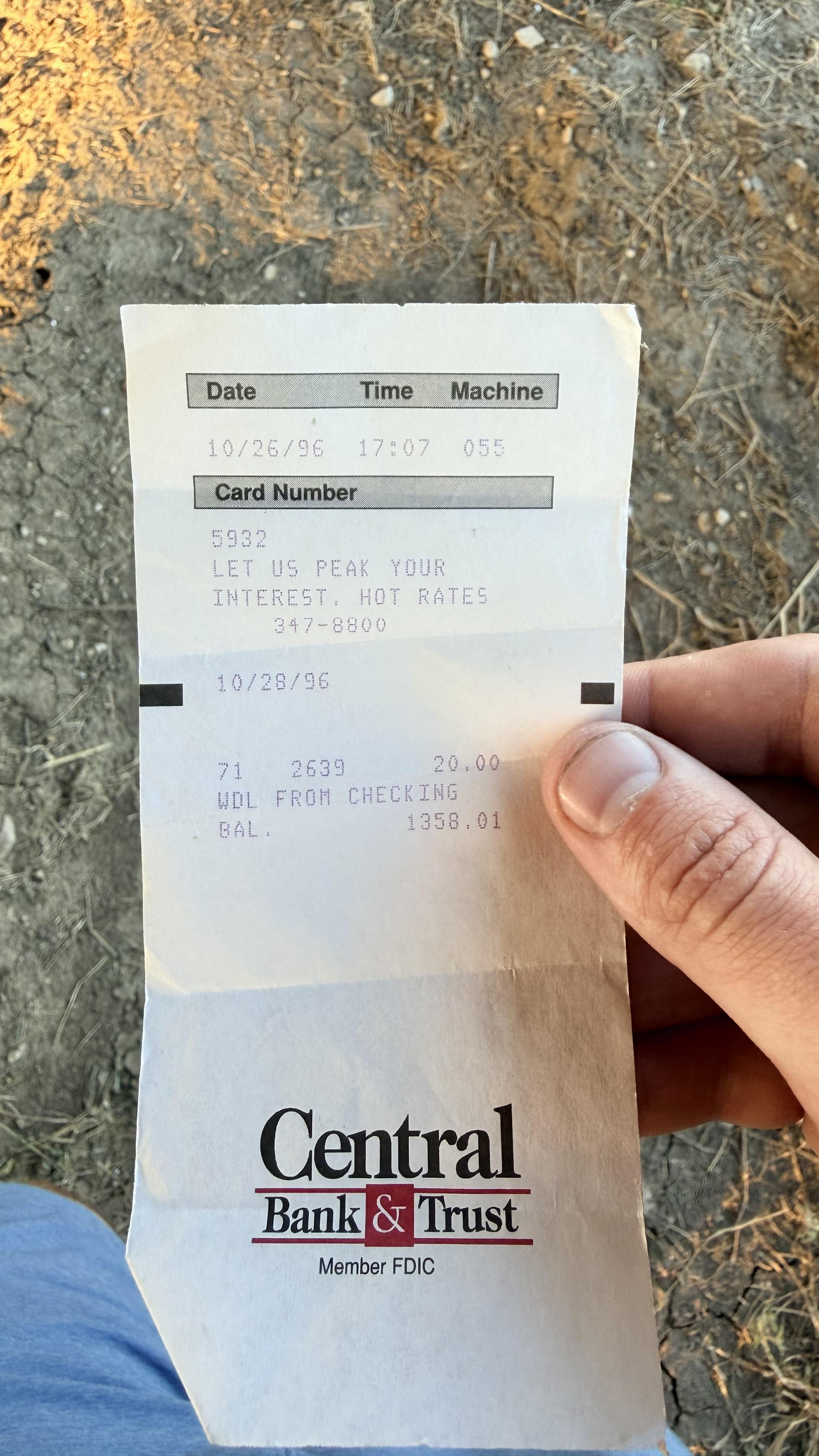 Your receipt almost certainly came from an ATM in Worland, printed on October 25, 1996, around 5:07 PM.