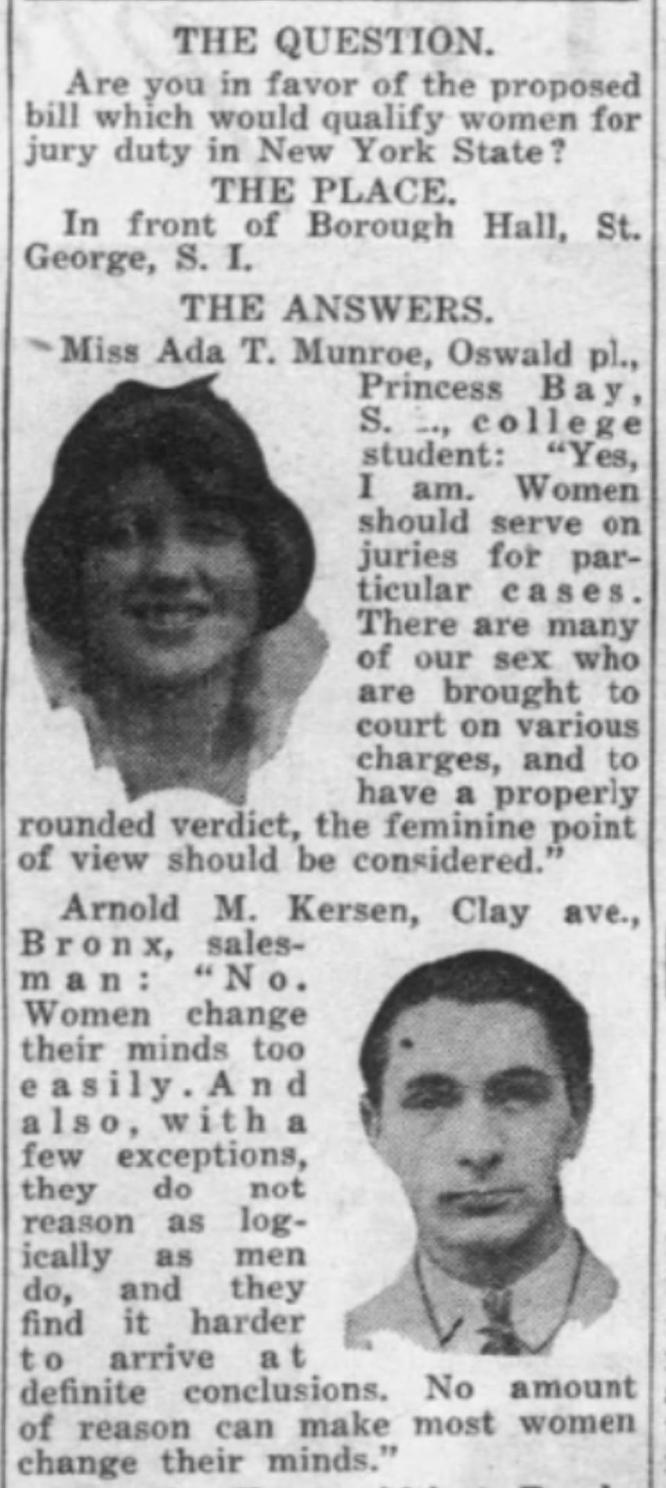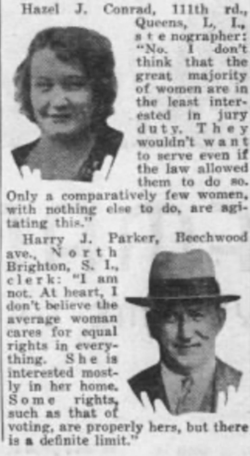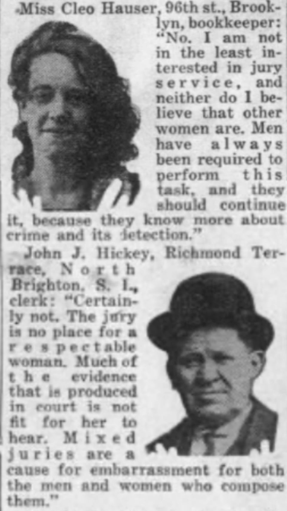 The Inquiring Photographer asks: “Are you in favor of the proposed bill which would qualify women for jury duty in New York State?” April 30,1931. by CryptographerKey2847