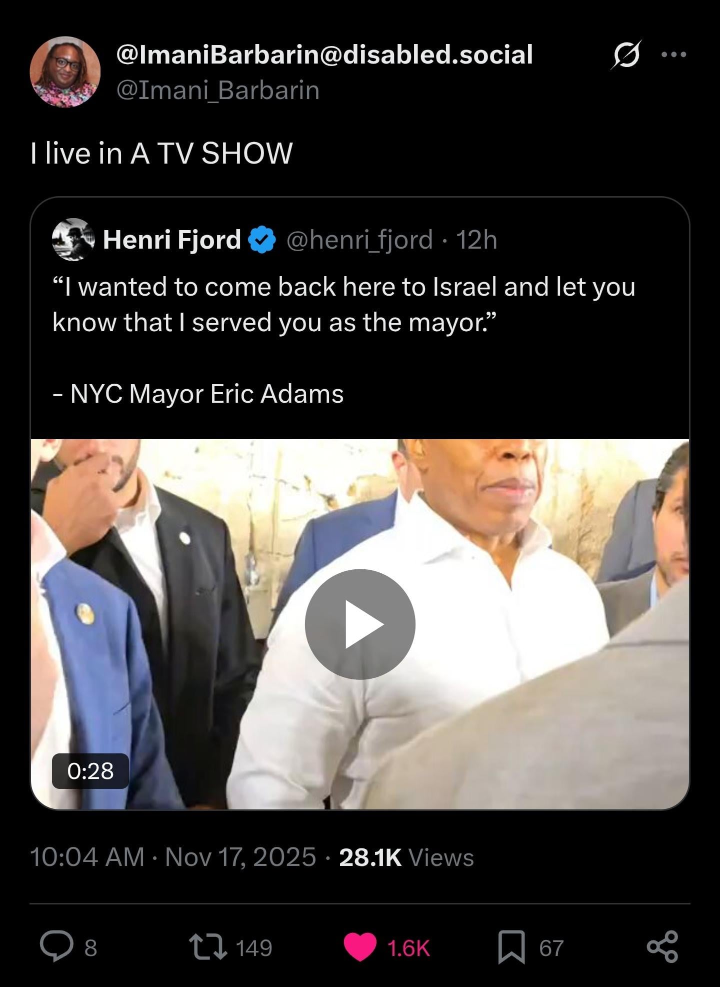 Chemical-Ideal1 on November 17, 2025 12:55 pm “Israel is the New York of the Arabian Peninsula” – Eric Adam (probably)