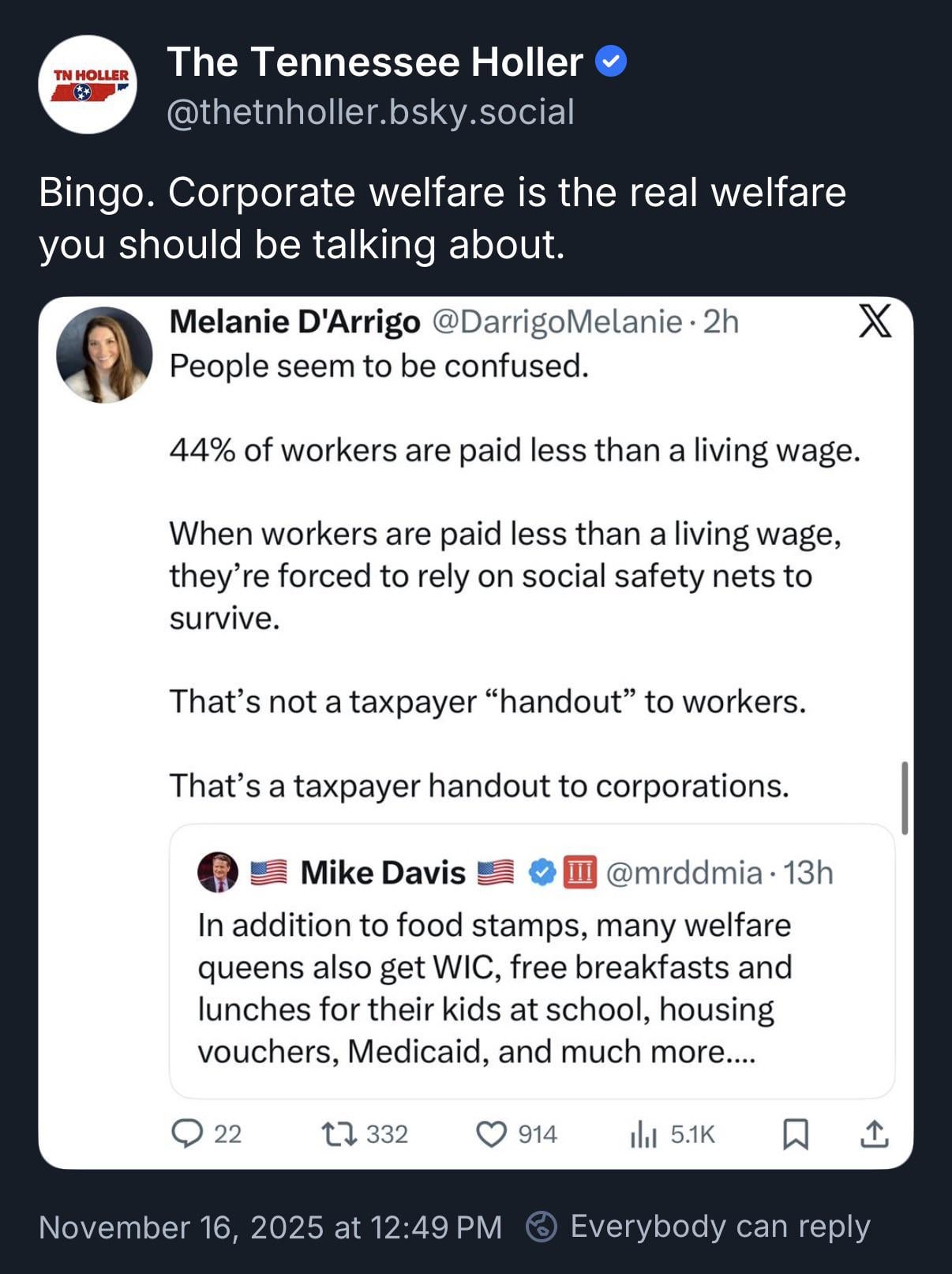 Melodic_Mulberry on November 17, 2025 12:38 pm We can’t remove the safety net and starve the people into demanding change because a lot of people wouldn’t survive. So we have to force the corporations to pay ethically and make the net redundant.