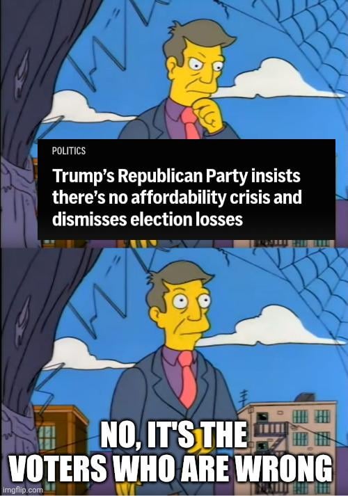Boomtown626 on November 17, 2025 11:51 am To be fair to principal Skinner, 80 million fuckwits preferred the current asshole over a woman of color.