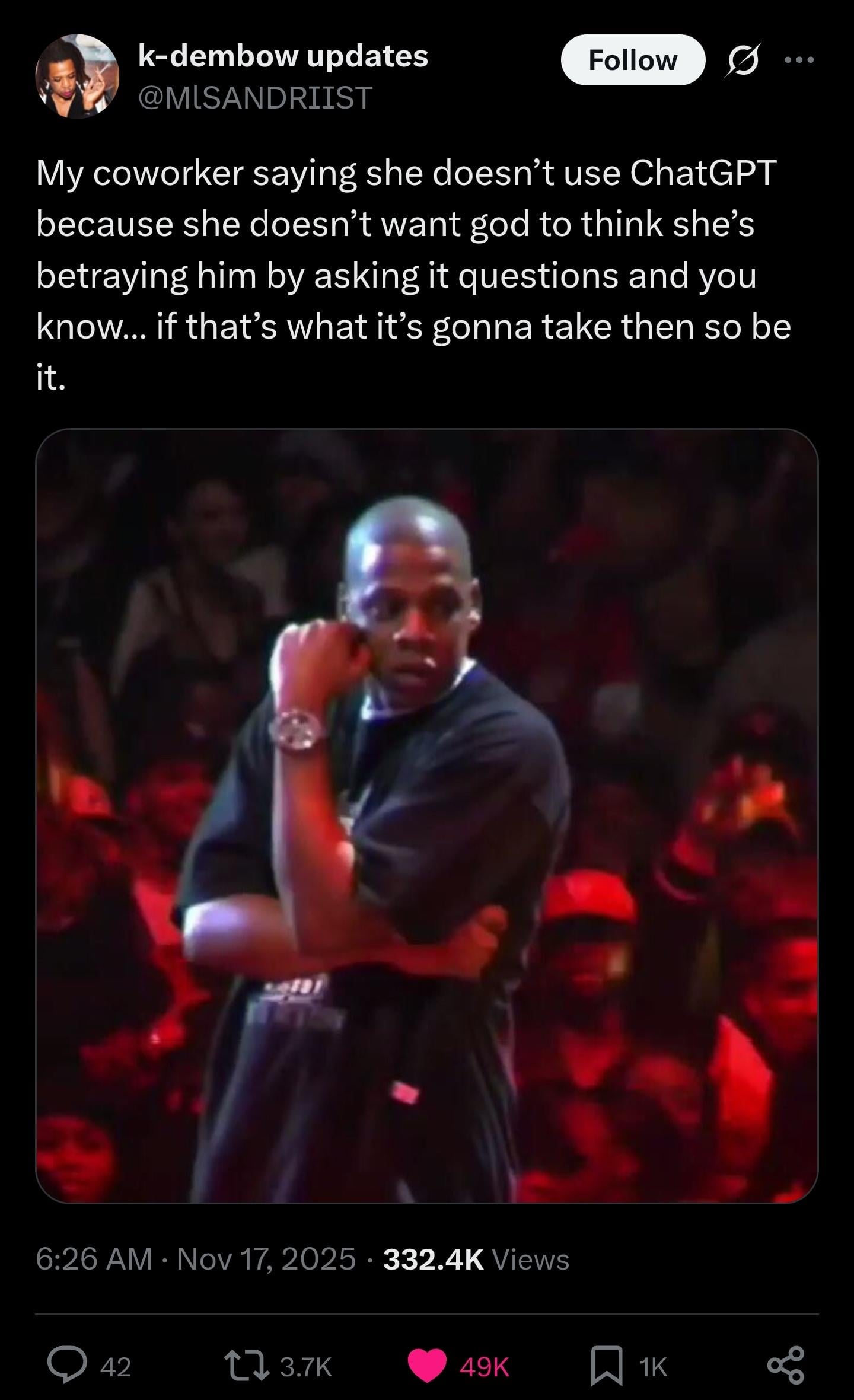 1. This person at work wrote an album’s worth of lyrics but he made AI song them because he doesn’t have the voice for it. He was a perfectly fine guy, but we got him fired because FUCK AI ^/s
