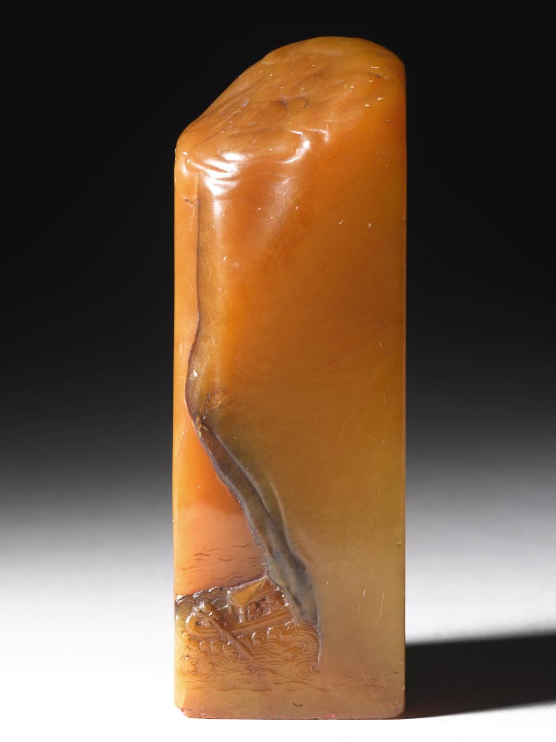 Tianhuang (“heavenly yellow” soapstone) seal depicting the legendary 11th-c poet Su Shi in a boat at the base of the Red Cliff with a waterfall. Carved by Qian Song (1807-1860). More pics in museum link in comments. Brooklyn Museum collection [1124×1500]