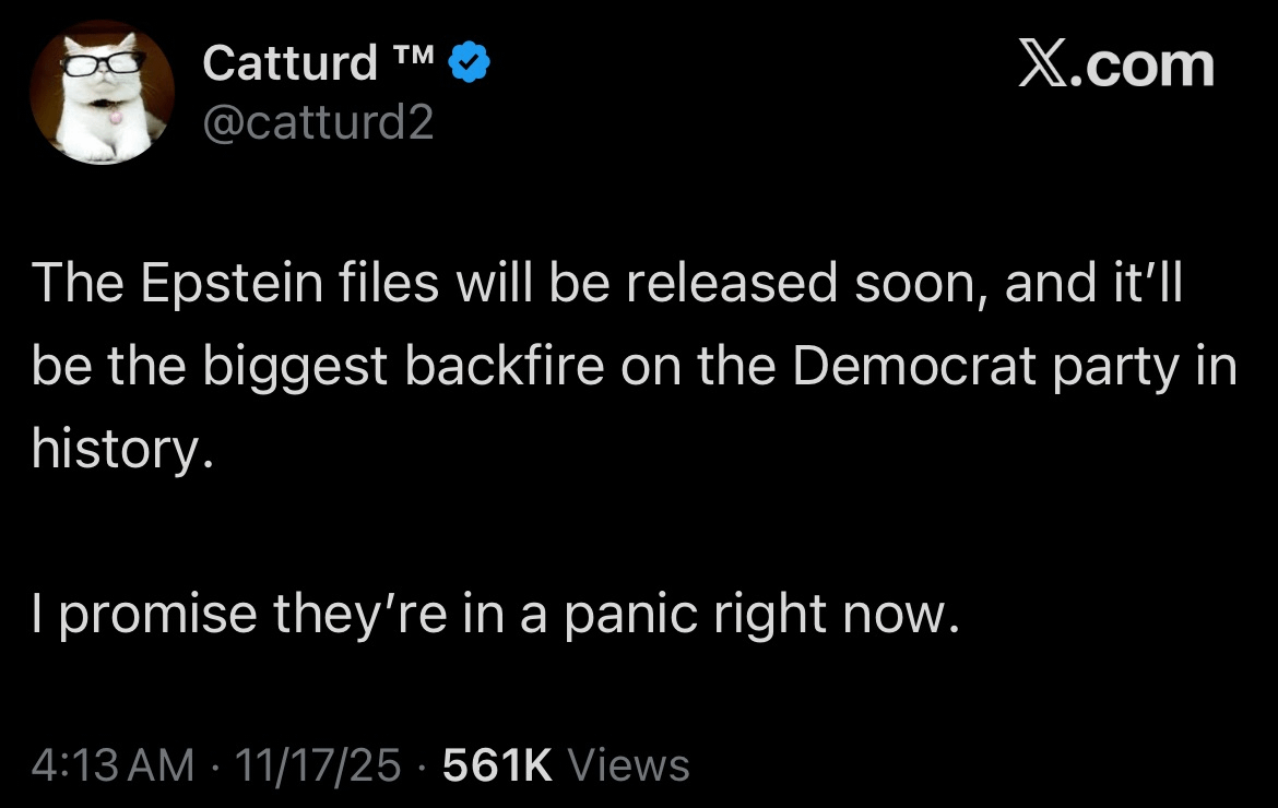 I’m sure the fact that Trump did a complete 180 from “The Democrat Epstein hoax!!” to “Republicans should vote to release the files!!” literally overnight means that they’ve finished redacting all the GOP names from whatever copy of the files they’re agreeing to release.