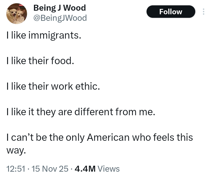 I adore immigrants! I work in healthcare and they’re always my kindest patients.