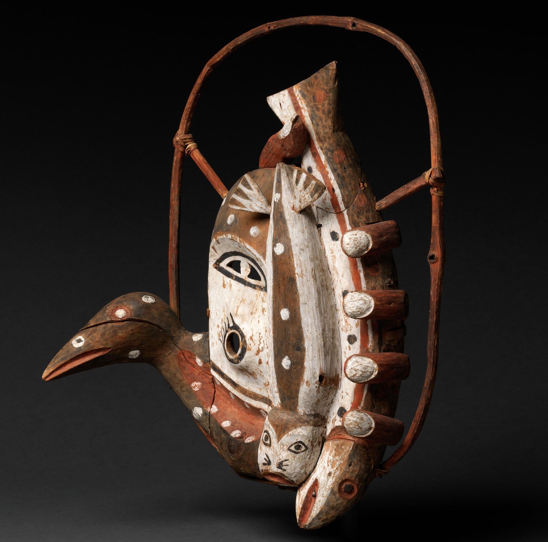 [Museum](https://www.metmuseum.org/art/collection/search/717572). Worn during dance ceremonies, this Yup’ik mask depicts the artist’s vision of the universe. The whimsical imagery combines elements drawn from the Arctic realms of earth, sky, and water, such as the face with a black paw motif, the finely rendered fingers of a human hand grasping a fish, the head of a bird, and the seal. The bent willow bow that frames the central image once held feathers or other adornments.