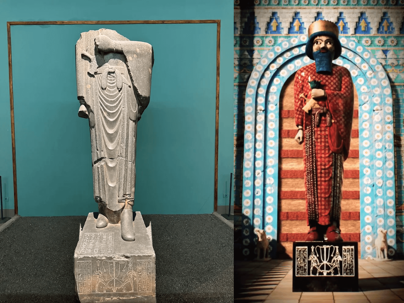 Reconstruction of the Darius the Great Statue, standing 3 meters tall without its head. Made in Egypt under Darius and brought to Iran by Xerxes, it was too heavy for Alexander the Great to topple, so he broke its head and struck the body, with his sword marks still visible on the statue. [1322×992]