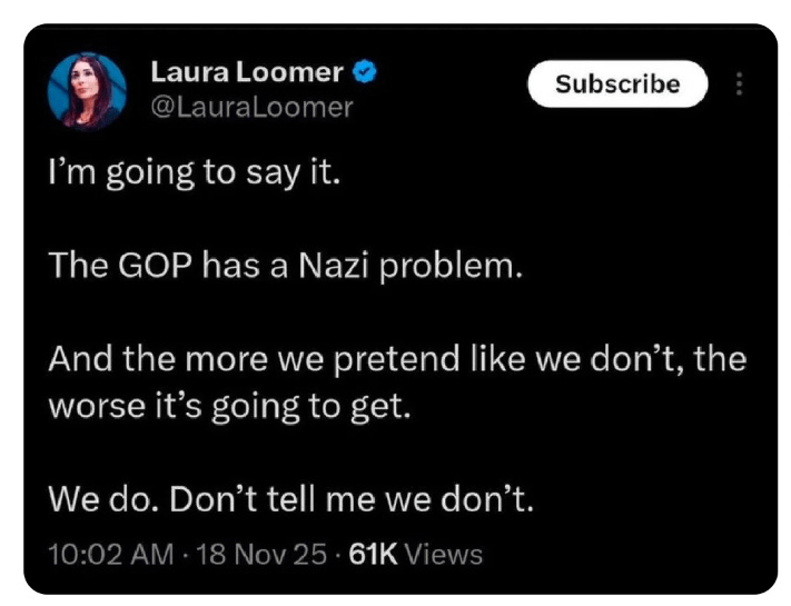 Didn’t have Loomer calling out the Nazis in her party on my “America 2025” season finale bingo card TBH