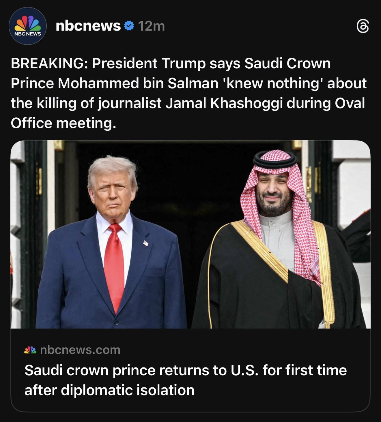 So the crown prince is just as incompetent a leader as trump? Because it’s either incompetence or cowardice to say “oh, I don’t know anything about that” in response to f*cking everything.