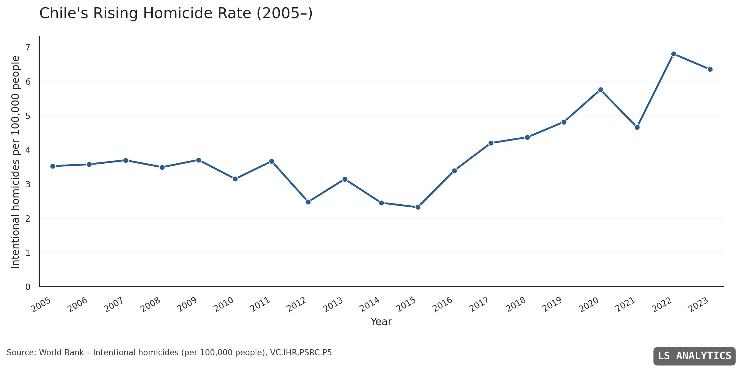 Data comes from the World Bank’s “Intentional homicides (per 100,000 people)” dataset, indicator code VC.IHR.PSRC.P5. Visualisations via Python