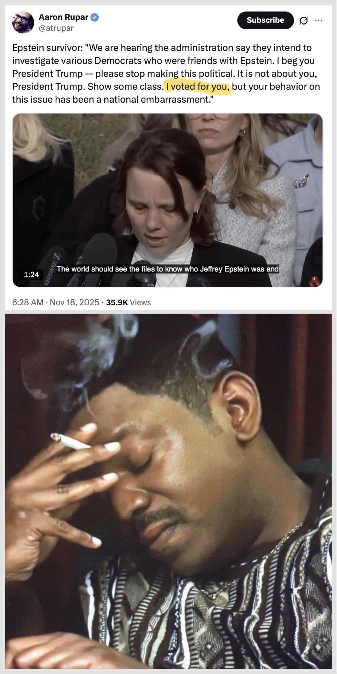 Suppose being an Epstein survivor doesn’t necessarily preclude being an idiot or a racist