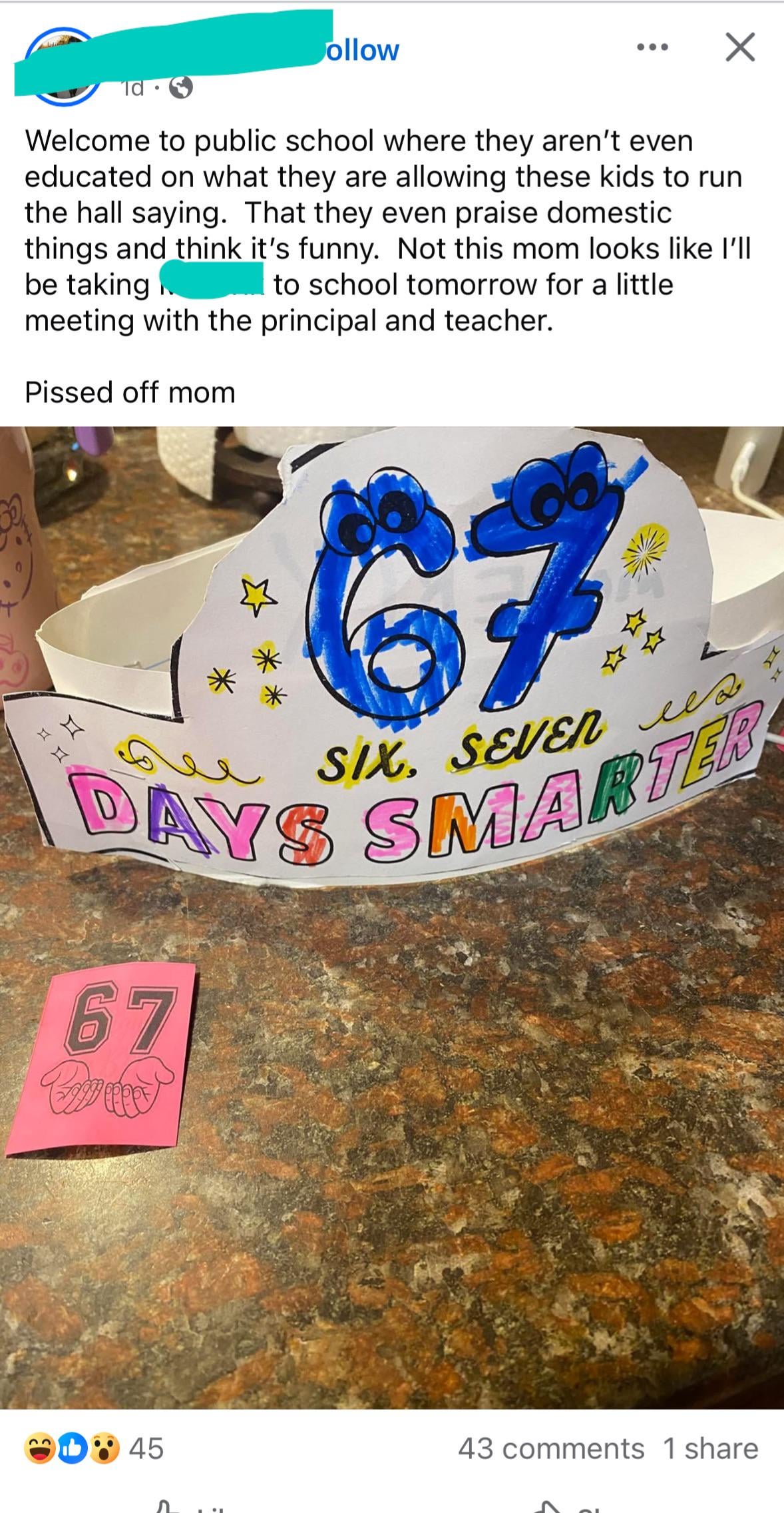 22. parents like this make principals insufferable. the teacher was trying to do something fun and now the principal has to have an earful over what? a number? I get that its annoying but all kids in all of history said some annoying phrase. and 67 isn’t even drugs or sex related like 69 or 420.