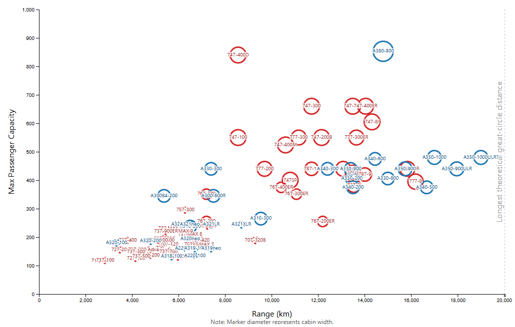 The official range and capacity numbers for the A350-1000ULR are not yet available so I've made a guestimate based on the stated plans to fly non-stop between Sydney and London/New York as well as the capacity of the A350-1000. For the other aircraft, I've pulled data from Wikipedia. The visualisation was then built in D3 to incorporate interactive elements. I'll note that the passenger capacity figures are meant to represent the theoretical maximum single-class or rated capacity of the aircraft and so are often much higher than what is typically seen in actual service. The range estimates are also meant to be maximums, so real world passenger-range combinations will be different. Data consistency and quality on Wikipedia can vary considerably so feel free to point out any issues.