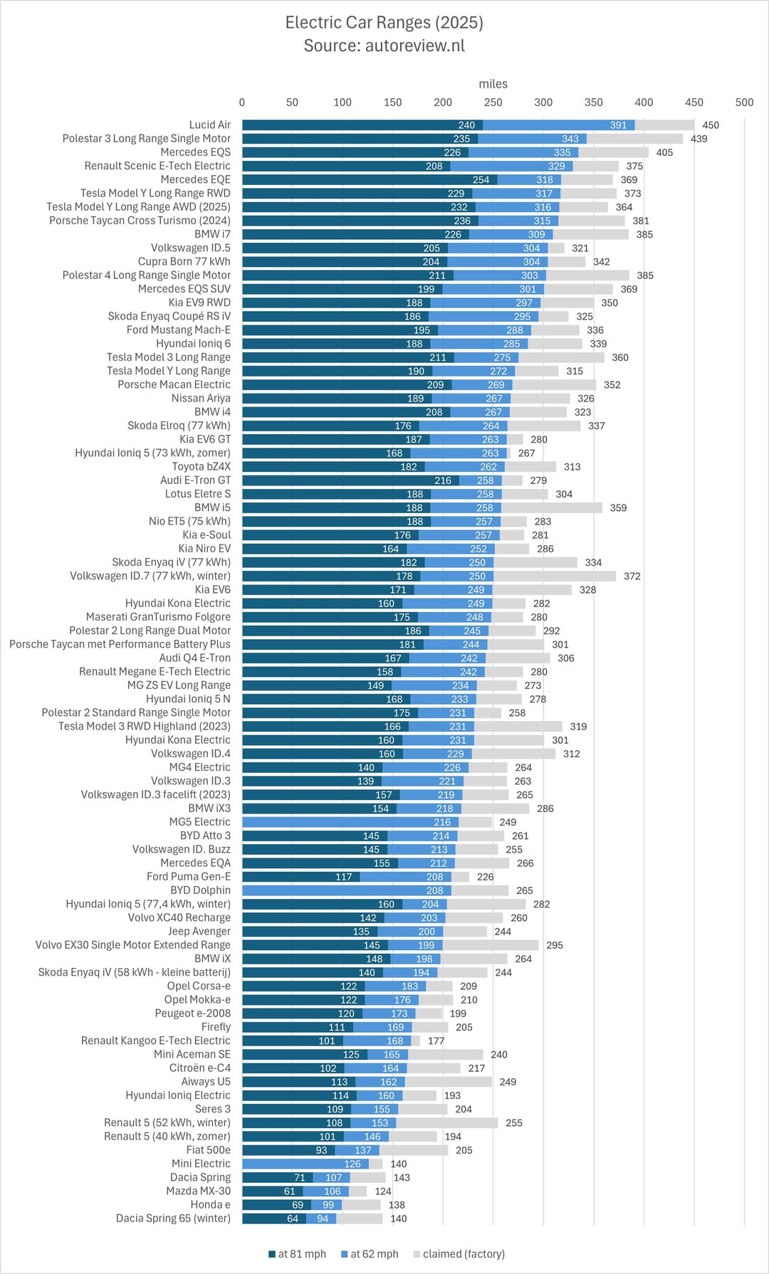 I saw this overview of measured ranges at 100km/h (62mph) and 130km/h (81mph) vs. factory spec on https://www.autoreview.nl/autotests/id/30073/top-deze-elektrische-autos-kwamen-het-verst-in-onze-test