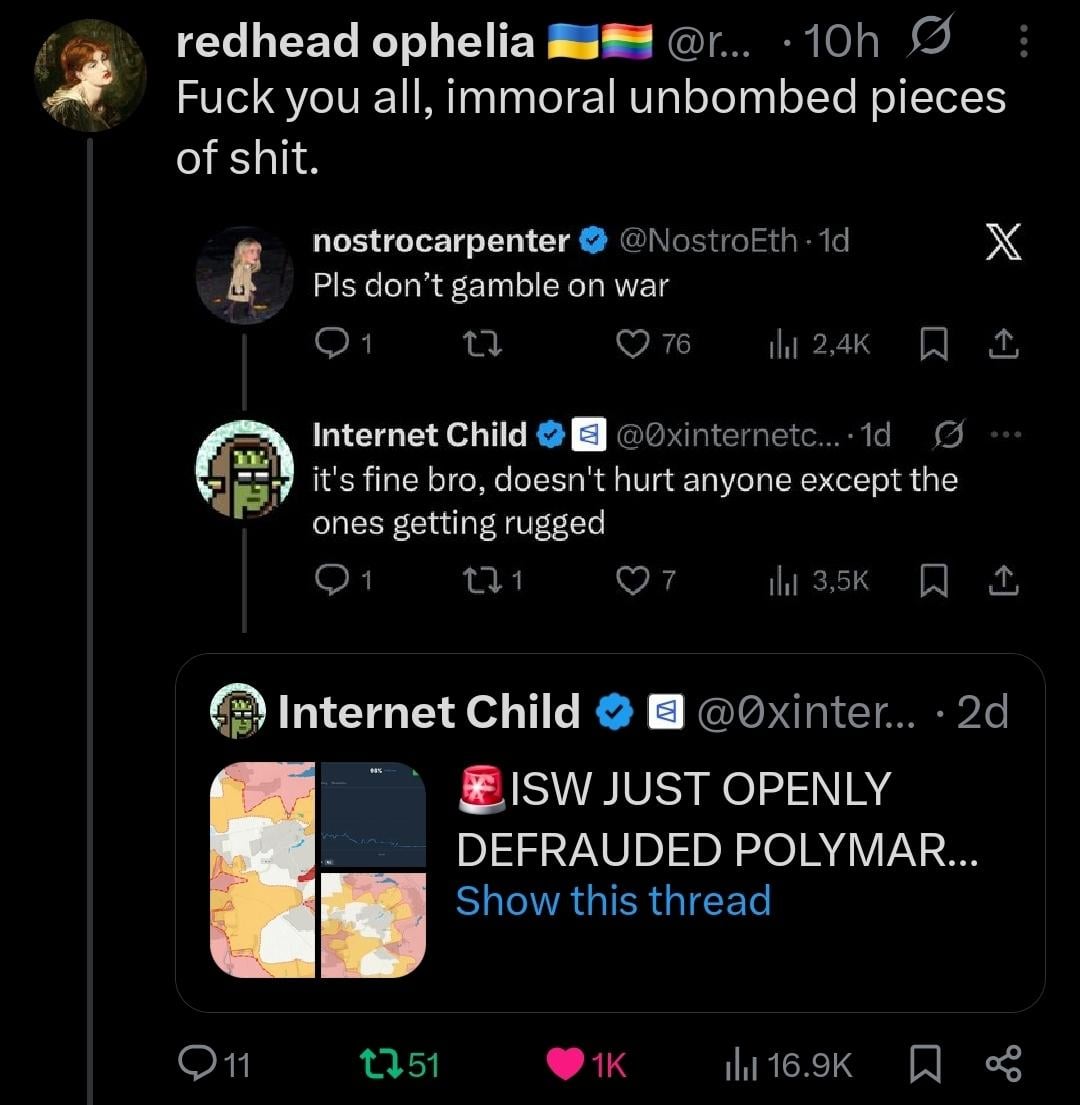 For context the redhead account is a bisexual Ukrainian woman. Ik not everyone who uses polymarket is like this but holy shit some of the worst people in society are absolutely addicted to it.