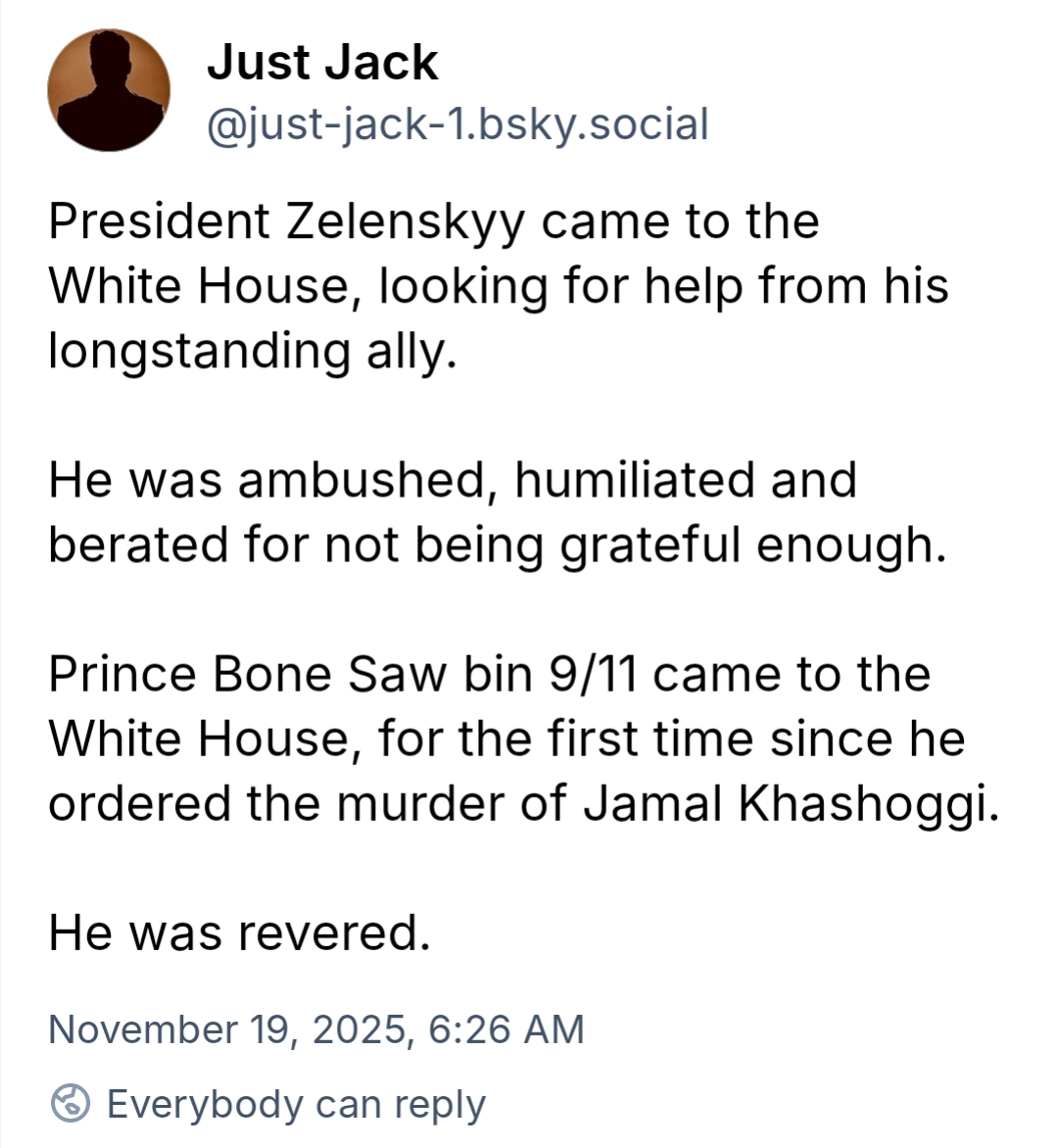 The POTUS just made a baseless accusation defending the murder of a legal US resident of Virginia by a dictatorship regime whose citizens were the majority of 9/11 terrorists. Let that sink in. What in the actual cunting fuck?