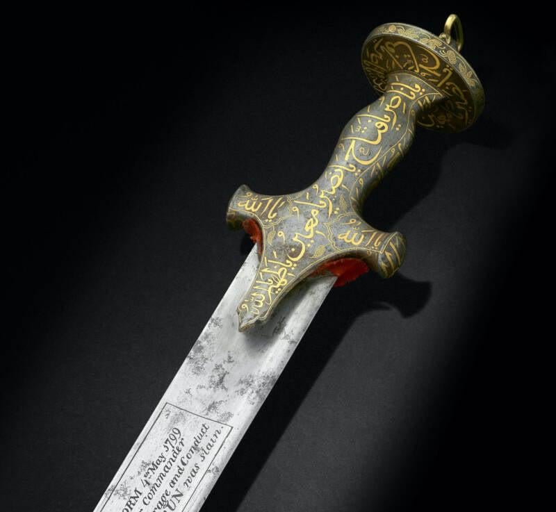 The fabled sword of Indian ruler Tipu Sultan, who fought off British colonialism in the late 1700s. Measuring three and a half feet long, it was made with Wootz steel and adorned with gold calligraphy. [800×737]