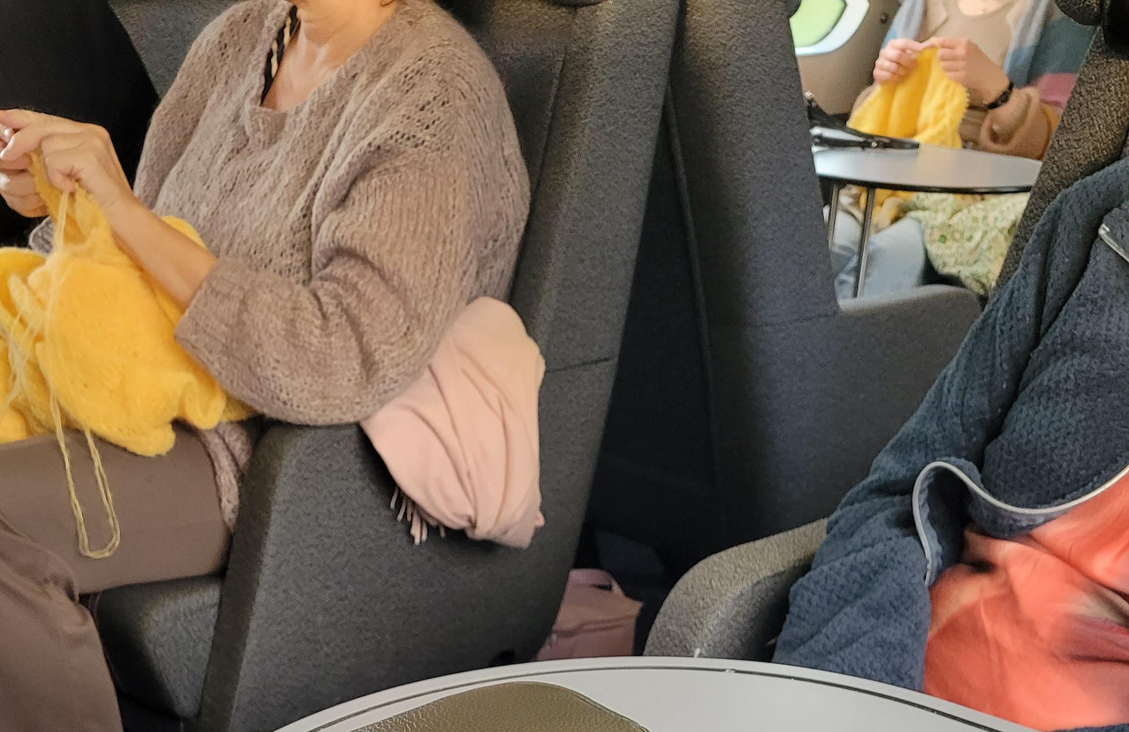 It would be way more interesting if it were two women knitting a single yellow sweater on a train, as your title implies. Which I guess means you’re in the right place.