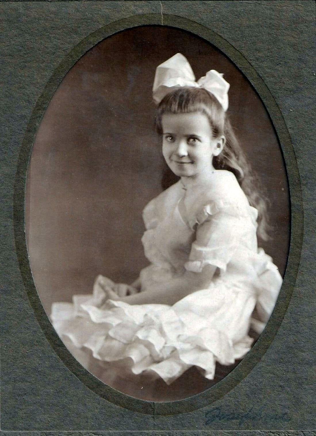A large mounted photo from my collection. One of my favorites because she is such a happy, pretty little girl in a beautiful frilly white dress and large white bow. The only informatoin on the photo is the name "Josephine" on the front.