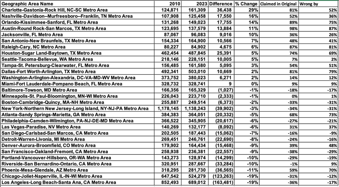 I saw the erroneous (2nd) chart pop up all over different reddit subs and on social media, and I can't believe how much traction it got despite having no source. (Here's the source for my chart, the first one: Link to Census data.) So many of the numbers aren't remotely believable: 98% increase in Austin; 81% in Dallas; 68% in Atlanta; 59% in Phoenix.