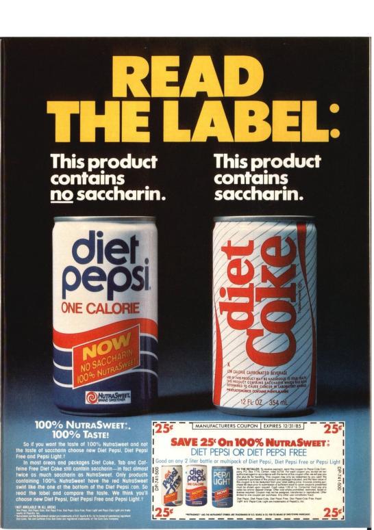 Diet Pepsi vs. Diet Coke sweetener ad, 1985.