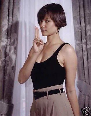 Smokin’ Carey Lowell, the only Bond girl who looked sexy with a mop top, holding fingers in a gun pose. 1989. by MidnightWhispero