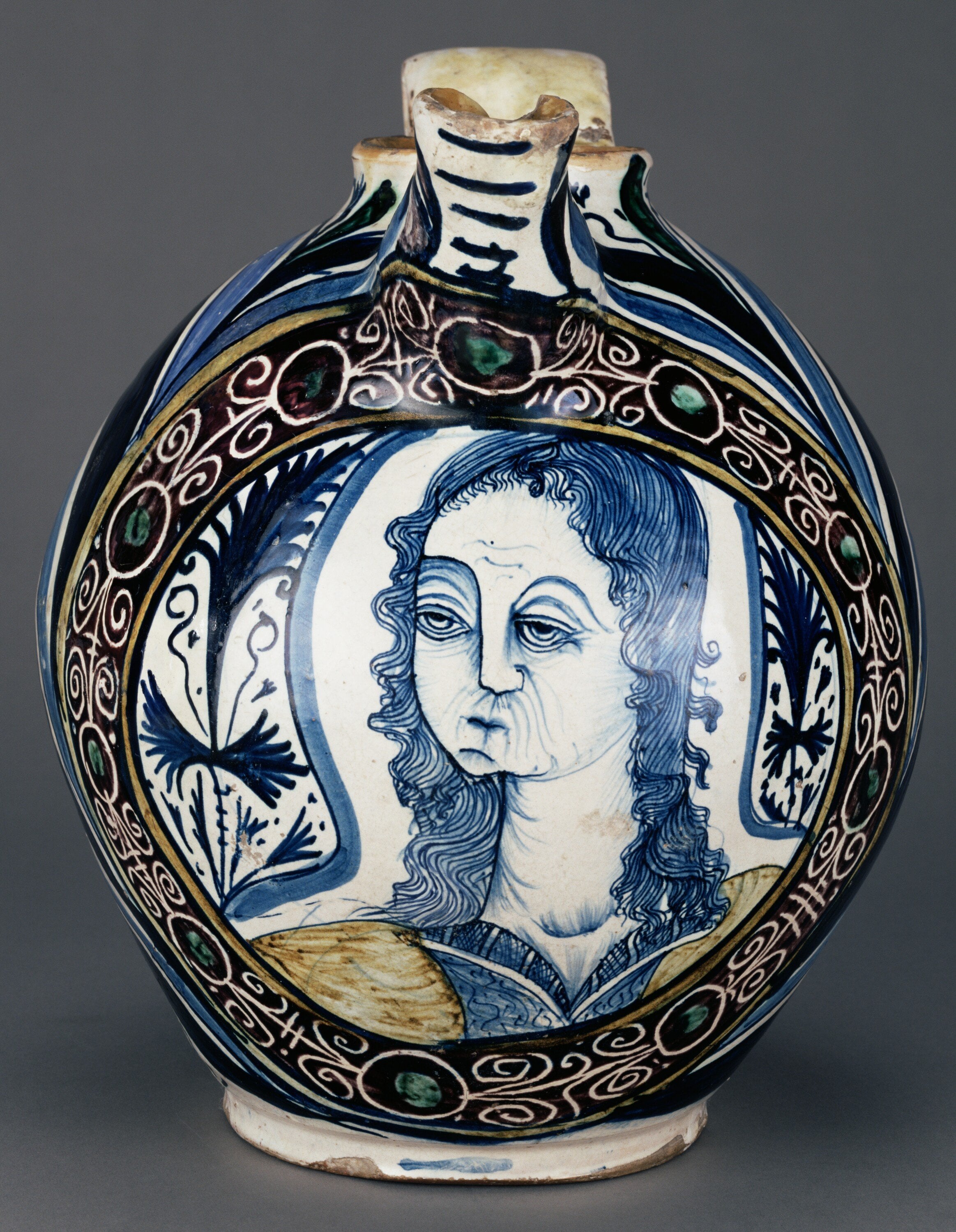 >Underneath the spout is the lined face of a man whose long hair and full-sleeved jacket are typical of masculine fashion in the 1400s. The artist has chosen to represent not an idealized man but a real one, showing his wrinkled forehead, heavy-lidded eyes, and sagging jaw.