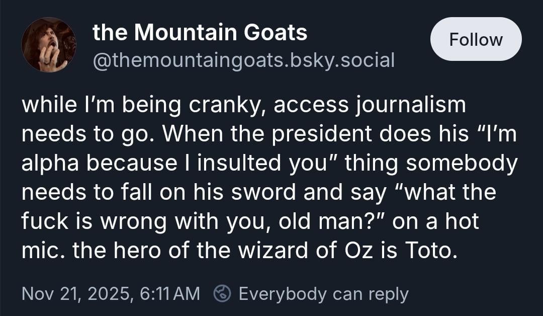 I see someone’s a Jeff Tiedrich fan. The first reporter to stand up and ask “what the fuck is wrong with you” should get a lifetime Pulitzer was a blurb he used to put in his daily email. Do I agree? Fuck yes.