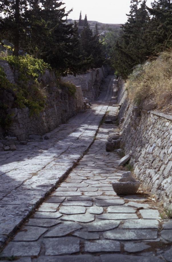 The oldest paved road you can walk in Europe is the Minoan Royal Road in Crete, Greece, which is over 3.500 years old. The road included side drains to handle water runoff, a feature that helped preserve its structure by preventing water damage [603×920]