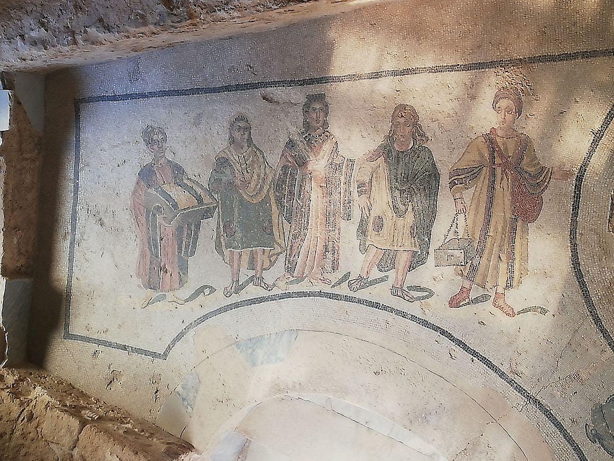 Roman mosaic showing the domina in the company of Germanic slaves with long blond hair and servants carrying boxes and tools for massage oils. [1200×900]