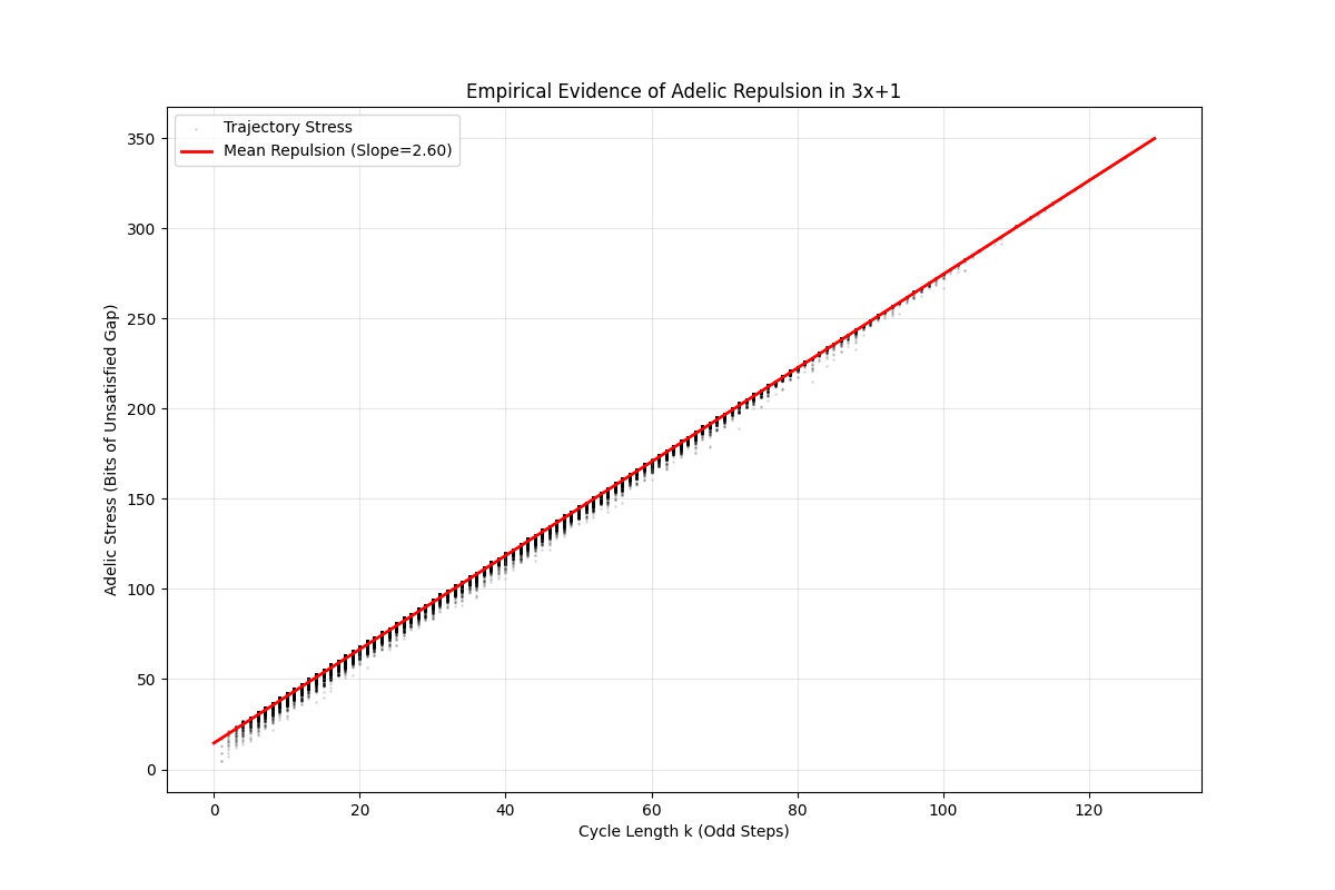 I analyzed 100,000 Collatz trajectories to measure the “Arithmetic Pressure” preventing cycles. The result is a perfect linear barrier (Slope 2.60) [OC]