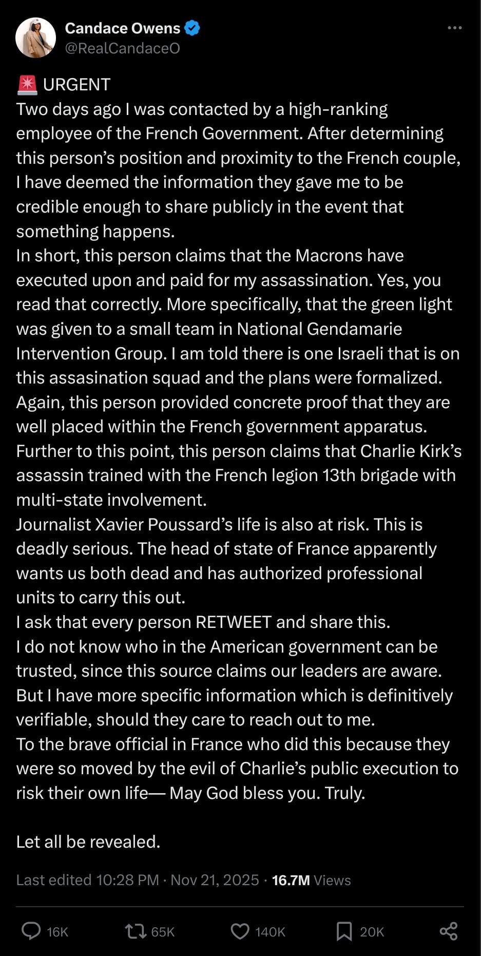 FamousPastWords on November 22, 2025 11:01 pm A certain group will be quite upset to hear that Candace thinks the assassin was trained by the French. Quite an affront to them.