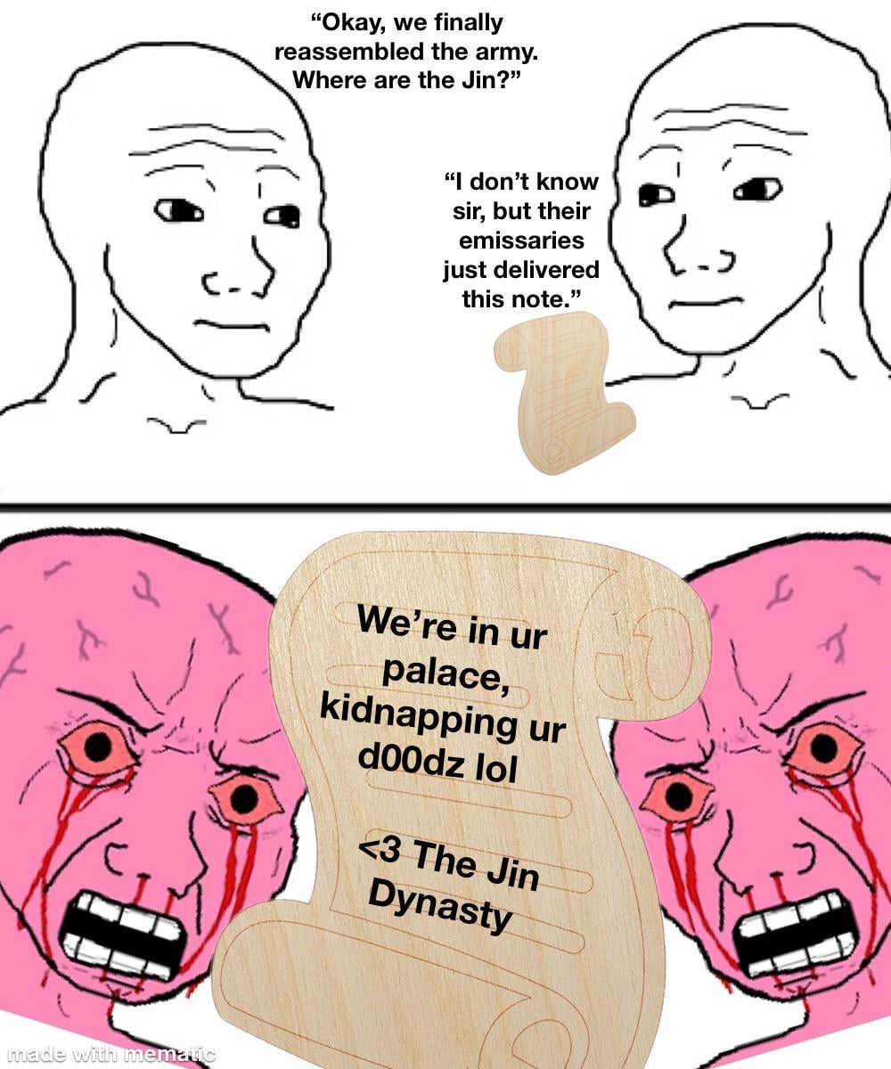 **Context:** After repelling the Jin Dynasty Invasion in February of 1126, Emperor Huizong of Song dismissed the majority of his army, believing the Jin forces would never return to the Song Dynasty. Instead, the Jin forces returned in September of the same year with an even larger army. With mostly inexperienced soldiers comprising the downsized Song army, the Jin forces cut through the country almost unimpeded. By the time the Song army had reorganized themselves, the Jin forces had sacked the capital of Bianjing in the Jingkang Incident, kidnapping the *entire* imperial court and their servants, but left the civilian population untouched. On January 9th, 1127, the Song Dynasty surrendered and its people forced to pay heavy tribute to their new rulers.